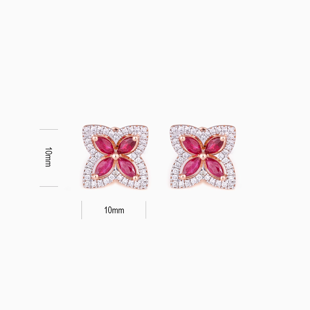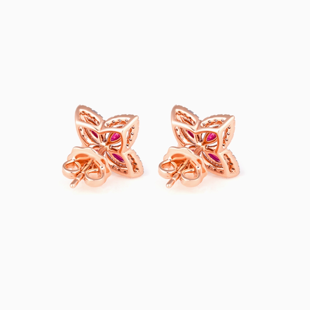 زيّني إطلالتك بأقراط فجر الآسرة من مجموعتنا المميزة. تتألق هذه القطع الجميلة المصنوعة من الذهب الوردي عيار 18 قيراط بـ 0.3 قيراط من الماس متلألئ والياقوت المشع. مزيج مثالي من الأناقة وجمال الطبيعة.
